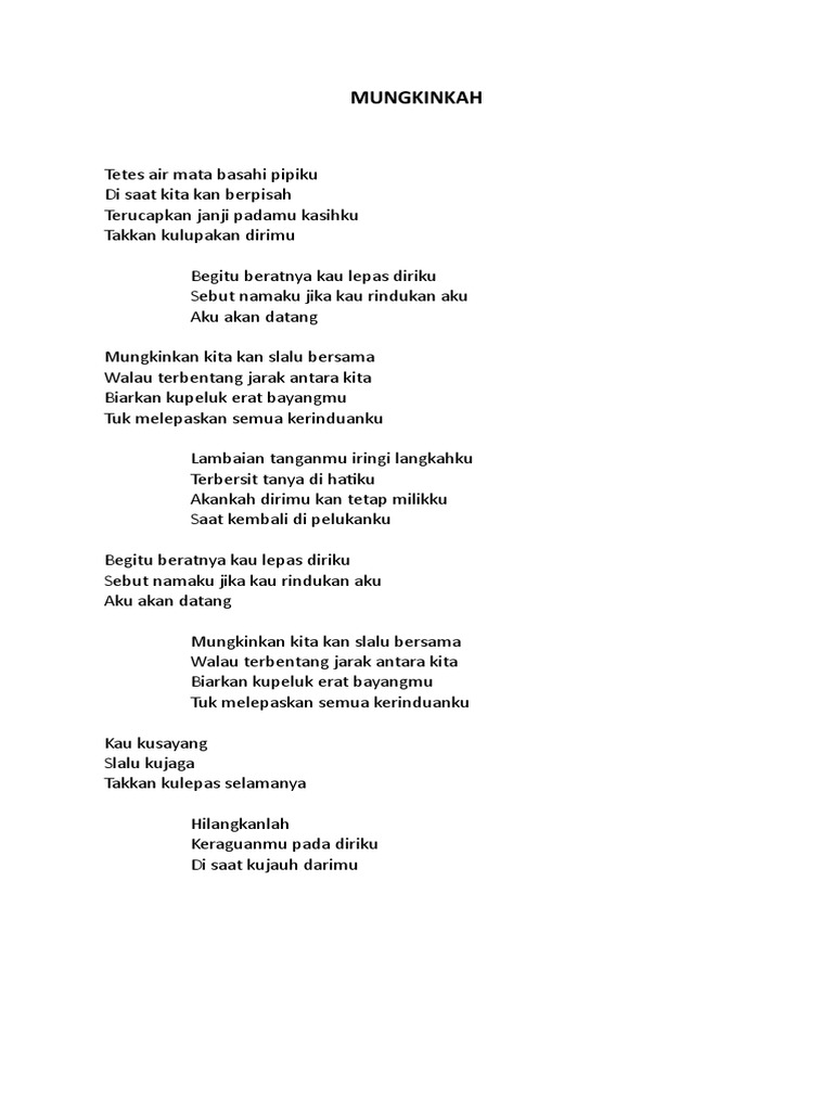 Mungkinkah Tetes air mata basahi pipimu. Aku akan datang Mungkinkah kita kan selalu bersama Walau terbentang jarak antara kita Biarkan ku peluk erat bayangmu Tuk melepaskan semua kerinduanku Lambaian tanganmu iringi langkahku Terbersit tanya di hatiku. Mungkinkah kita kan selalu bersama.